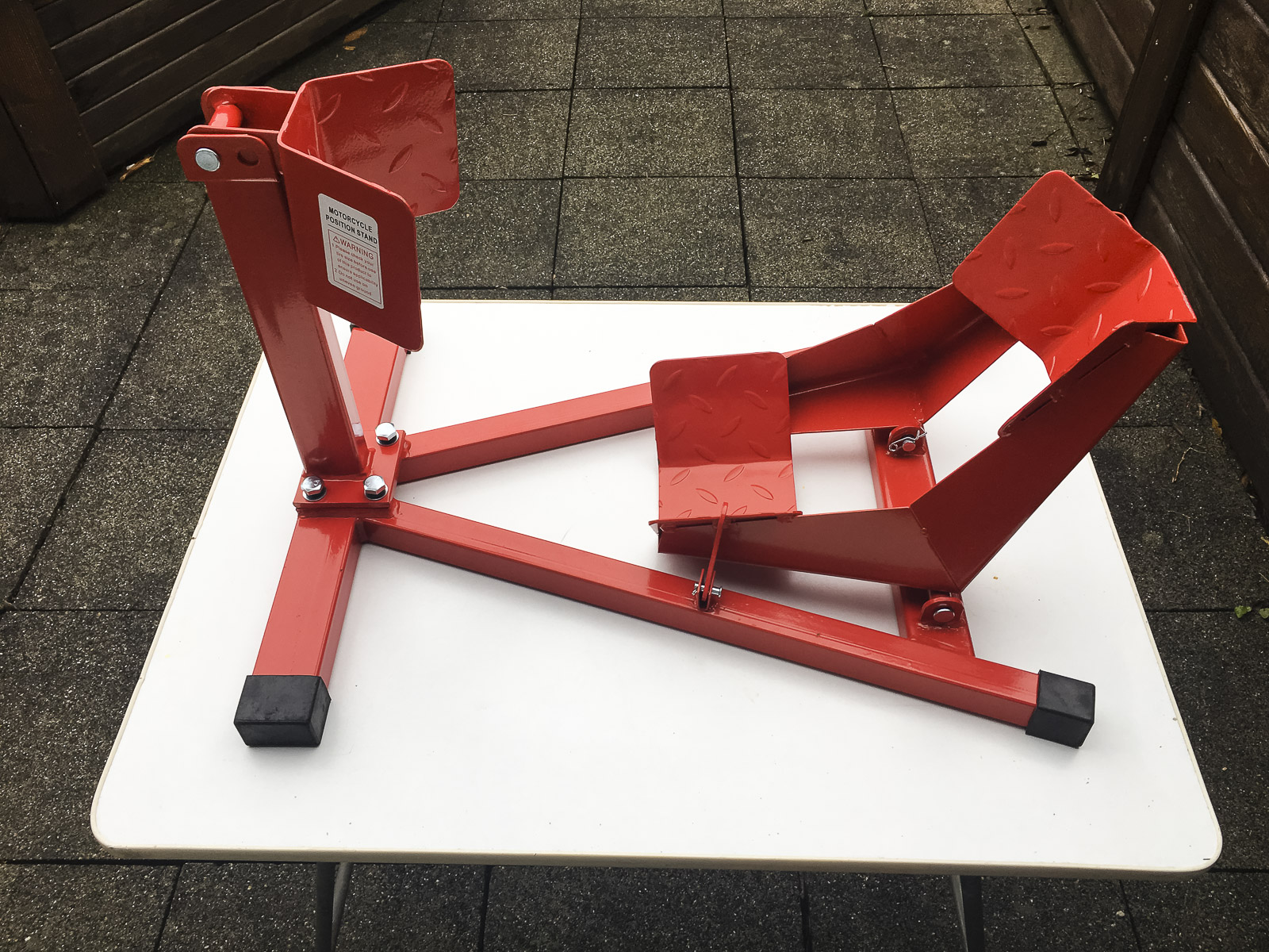 Kurze Motorradstandschiene mit Wippe und Vorderradanschlag. Für Reifenbreiten von 90 – 150 mm
