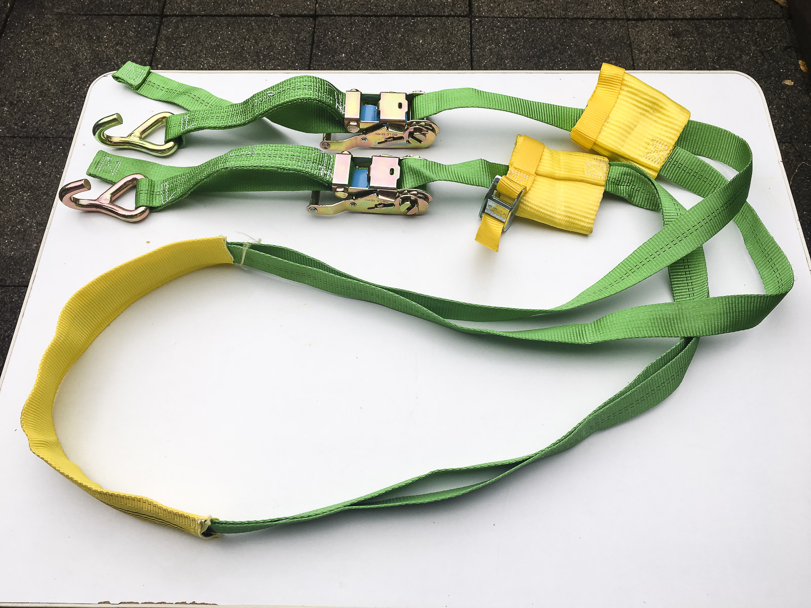 4er Set Dreipunkt-Spanngurte mit freilaufenden Doppelspitzhaken und Ratsche – 50 mm Breite